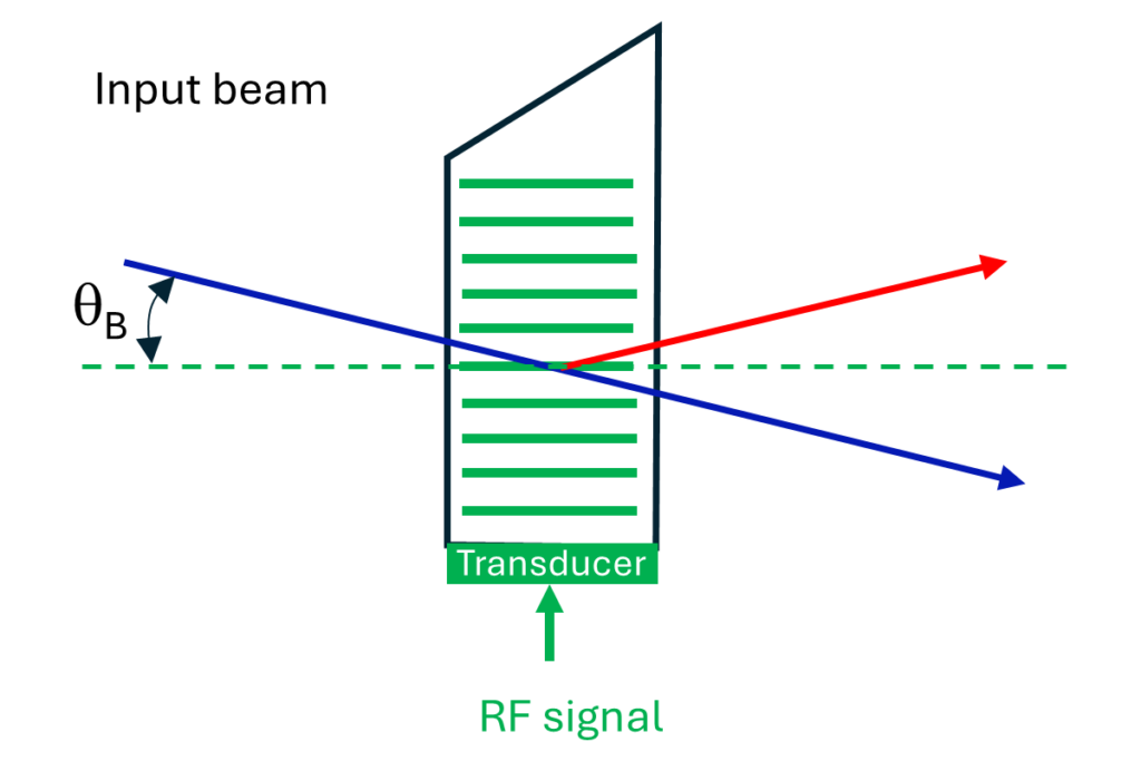 For a given orientation and optical wavelength there is a particular RF frequency which matches the Bragg criteria. However, there will be a range of frequencies for which the situation is still close enough to optimum for diffraction still to be efficient. This RF bandwidth determines, for instance, the scan angle of a deflector or the tuning range of an AOTF.
