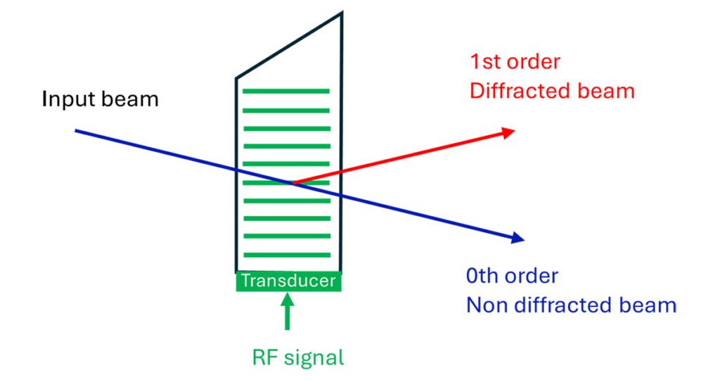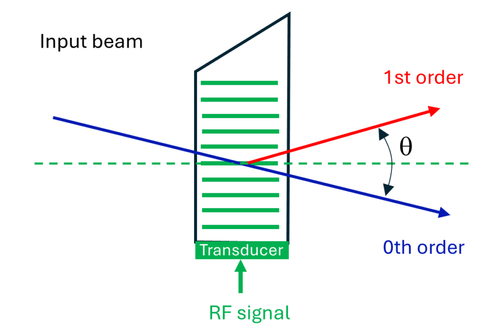 The zero order is the beam directly transmitted through the cell. The first order is the diffracted beam generated when the laser beam interacts with the acoustic wave.