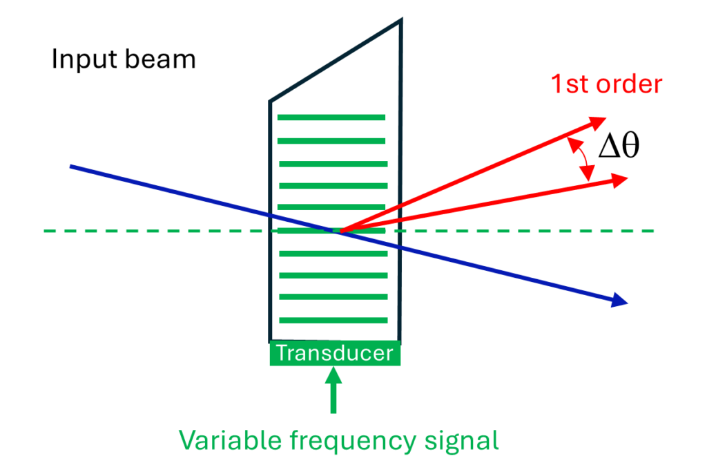 Proportional to the time the acoustic wave takes to cross the laser beam and, therefore, the time it takes the beam to respond to a change in the RF signal. The rise time can be reduced by reducing the beam’s width.